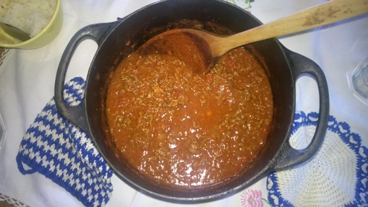 Låt köttfärssåsen småputtra på svag värme medan du kokar spagettin som ju hör till maträtten.